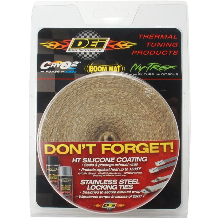 DEI does NOT recommend wrapping exhausts made of titanium. The alloys used in the production of titanium exhaust systems tend to be thin and are designed to dissipate heat quickly. Wrapping any titanium exhaust pipe, regardless of brand, can hold in too much heat, and make the titanium alloy turn brittle and prone to premature cracking. If you are seeking to reduce the heat on a titanium exhaust system, DEI recommends using alternatives such as our flexible heat shields.