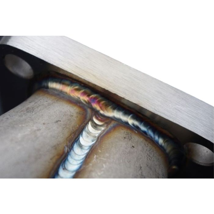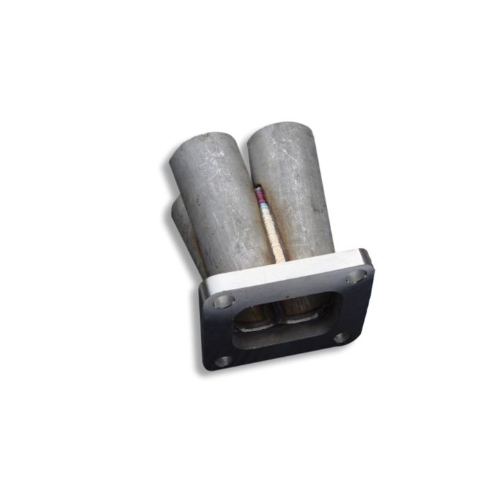 Sestup výfukového potrubí do příruby turbo. Nejkomplikovanější na výrobu a časově nejnáročnější část při vyrábění svodů. Rovnoměrně seříznuté a dokonale složené součástky jsou svařeny v argonové komoře. Jsou vyrobeny ze 100% nerezové oceli - příruba T4 má tloušťku až 13 mm, naopak vstup je vyroben z trubek 48 x3mm, což vylučuje jakékoli následné praskání svodů.