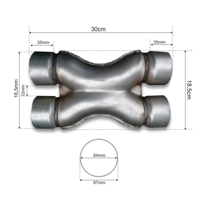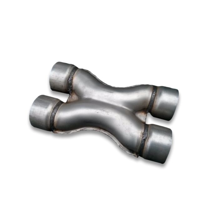 X-Pipe o průměru přívodu/ústí 63mm, vyrobená z nerezové oceli (SS409) a díky tomu velmi lehká. Nezbytná součást výfukového systému motoru typu V, v nichž urychluje vývod spalin a vyrovnává tlak mezi řadami válců. Pozitivně ovlivňuje zvyšování výkonu a otáčivého momentu, navíc ztišuje výfuk, který má díky ní zajímavější zvuk.