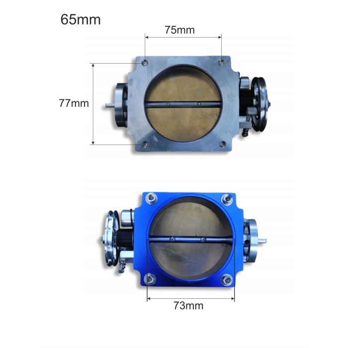 Tuningová škrticí klapka s průměrem 65mm. Perfektně namontované komponenty a přesné ovládání zajišťují okamžitou odezvu škrticí klapky a hladký chod. Je také vybavena ovládáním volnoběhu s blokovacím mechanismem a silnou hliníkovou přírubou přivařenou/přišroubovanou k sacímu potrubí. Díky výrazně vyšším průtokům ve srovnání se sériovým stavem jsou naše škrticí klapky široce používány v motorsportu - často se používají ve streeetu, driftu, drag atd.